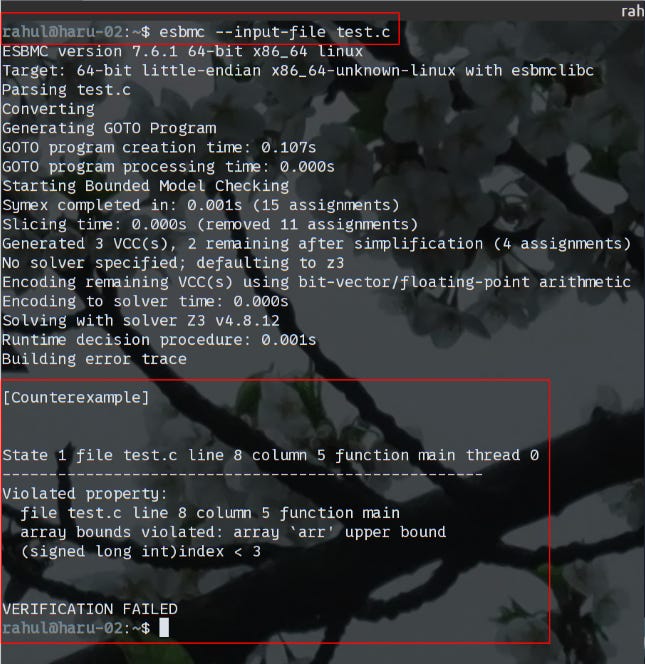 In this example, a C program was created with intentional pointer-access issues which simulates a core issue for arbitrary code execution is analyzed using Efficient SMT-based Context-Bounded Model Checker (ESBMC).