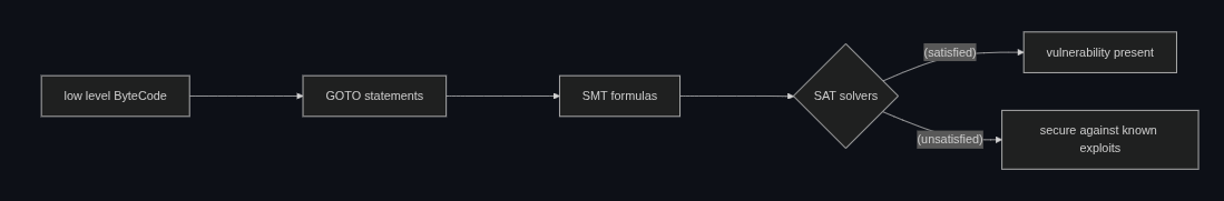 When specific switches of the switchboard (your program) are in the right order of "on" and "off", the pattern of conditions can be compared to patterns that are known to cause vulnerabilities. If they match, the formal verification program provides details of the vulnerability present. To create these switches the program is first converted into logical expression formulas referred to as Satisfiability Modulo Theories (SMT), which are a boolean representation of GOTO statements. An SMT can be thought of as the abstract form of the original byte-code. This SMT formula is then verified against verification conditions indicating a security vulnerability.