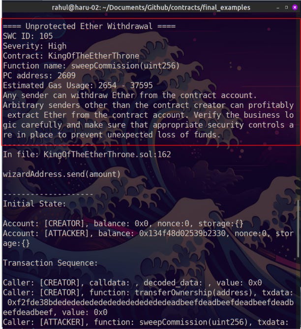 The highlighted text in the image above shows the final analysis of the given Solidity contract. Along with an explanation of the vulnerability, it also gives us the potential resource consumption of the contract in terms of estimated gas usage.